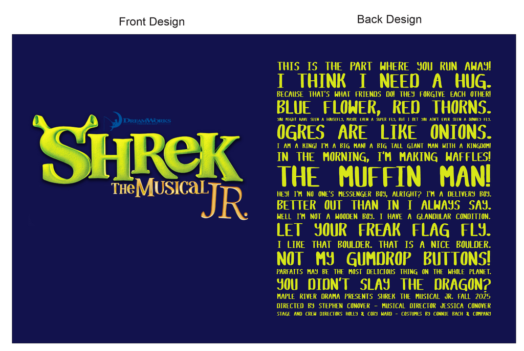 This fall drama design will be offered on unisex navy tshirts, long sleeves, and hoodies. The tshirt and longsleeve are 100% cotton and the hoodie is a 50/50 cotton/poly blend. These items will have a full color front and back design. You can have a name printed horizontal on the upper sleeve for an additional cost.